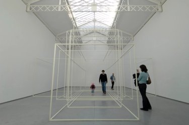 ‘The Breathing Room drawings unusually predate the sculpture of the same name. The most recent drawings in the series Breathing Room vividly capture something of the effect of the glowing light as it appears in the gallery against the suddenly plunged darkness of the space. The interconnecting space frames of the installation are created through the use of lines made with a fine brush dipped in household bleach which removes the ink from its paper support and makes the negative outlines glow.