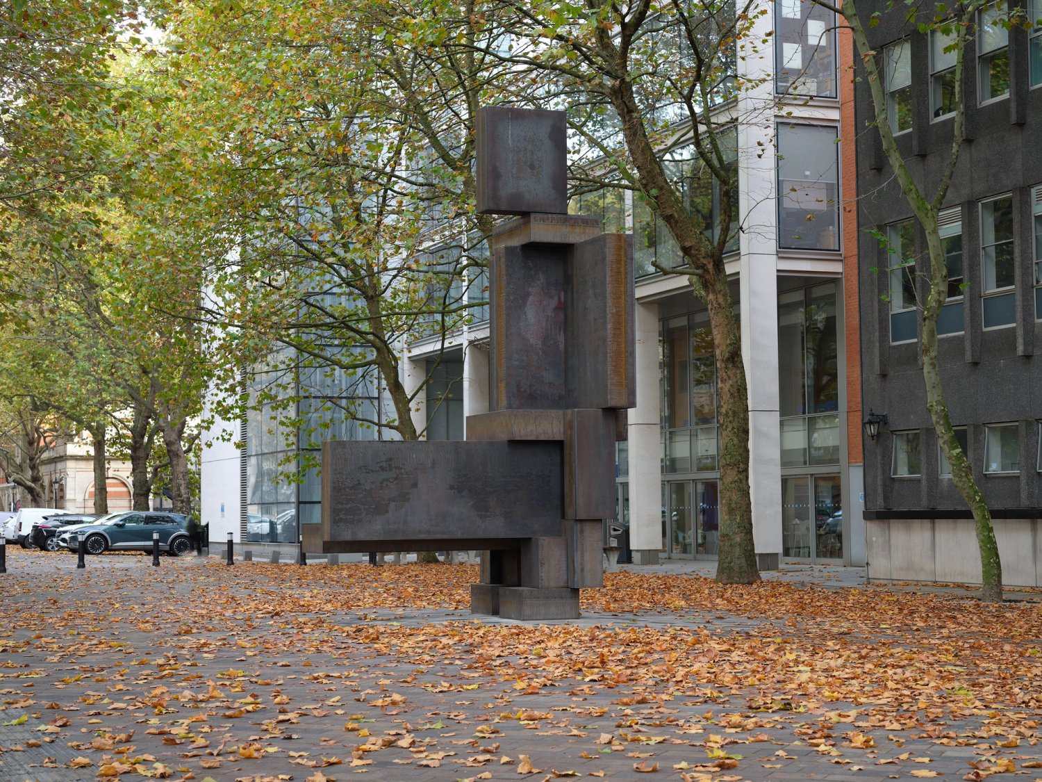 ‘The piece acts with the changing nature of the trees. In the summer the deep red oxidised surface will contrast with the vivid green of the plane trees’ leaves and in the winter its orthogonal geometry will act in consort with the organic inscription of their boughs.’