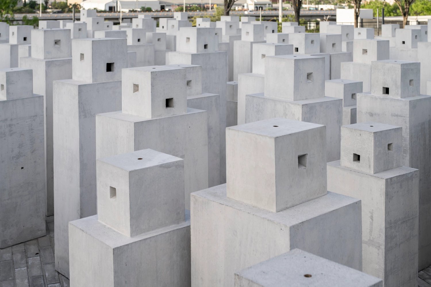 Allotment III comprises 300 life-size bunkers made of reinforced concrete. Each of the hollow, standing bunkers is made from the precise measurements of 300 inhabitants of Monterrey who volunteered to take part in the project. These measurements were then used to cast each concrete body-case.