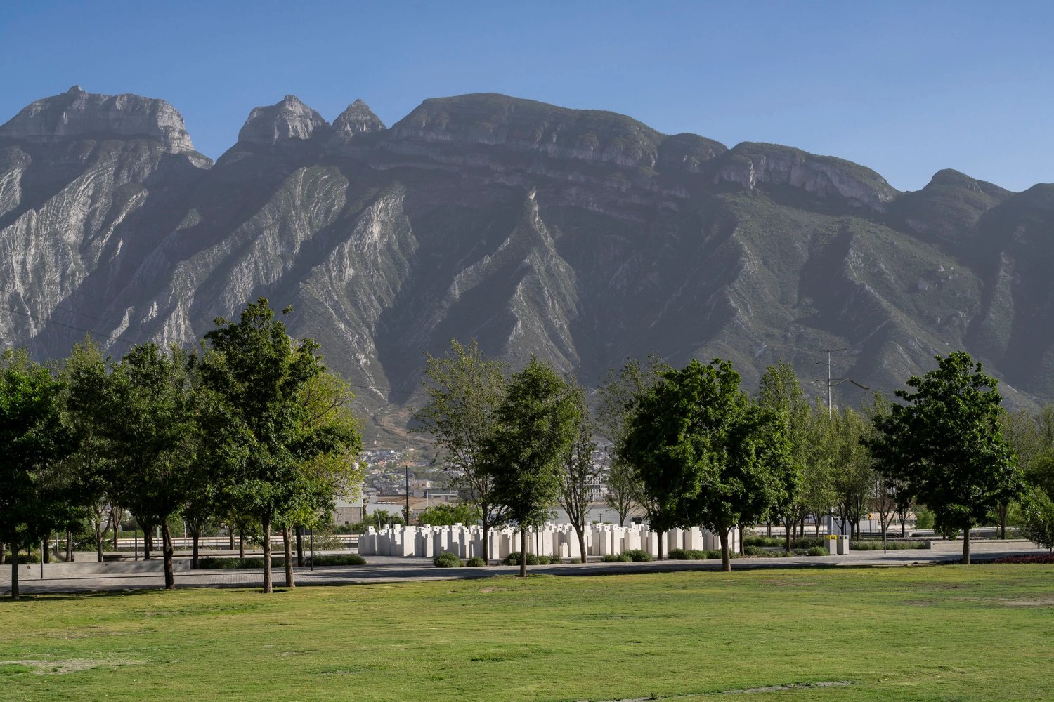 Together, the rows of bunkers, some clustered together in groups suggesting interpersonal emotional relations and others alone, form a collective body as a landscape or cityscape. The installation’s context is significant. Embracing its new educational setting, students from the university participated in the work’s restoration. Its specific location, too, makes us aware of our position in the built environment and our relation to the elemental world, located as it is between Tadao Ando’s ‘Gate of Creation’, the Cerro de las Mitras mountain in the distance and the palms, pylons and tower blocks that surround the university. Positioned outdoors, Allotment III will also show the dual effects of time and the elements: the longer the concrete bunkers remain in this setting, exposed to the sun, the more they will bleach and transform over time. Like the bodies they once cased, they will register entropy.