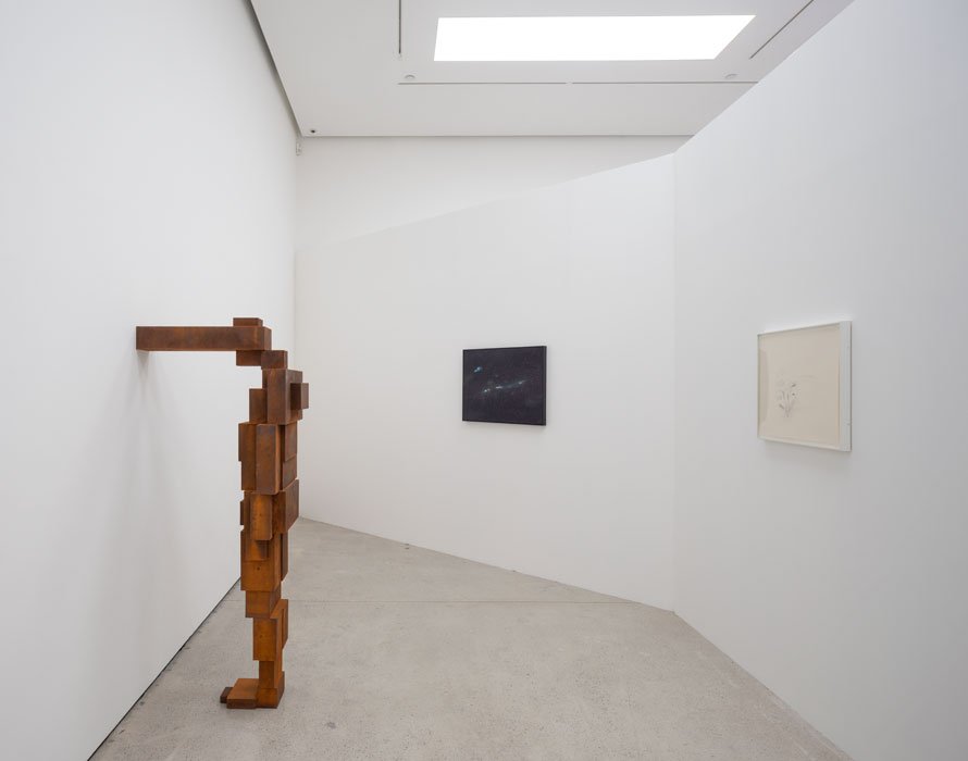 Antony Gormley's sculpture Butt (2010), alongside works by Fred Tomaselli and Darren Almond, explores memory in relation to time, as the figure's physical pose captures a moment of a lived emotional experience. Two works with a mythological theme, by Ansel Kiefer and Raqib Shaw, are also shown in the same space, inviting the viewer to consider the link between time and myth in connection to memory.