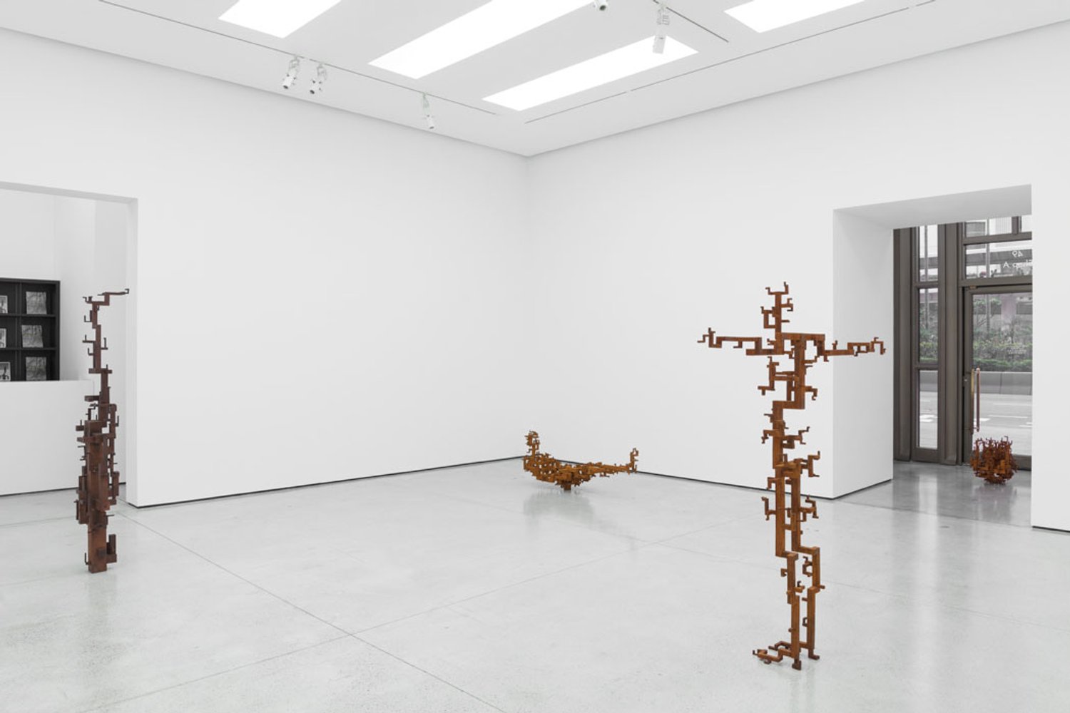 Rather than simply mimicking the branching systems of plants, these new works reveal their dynamic nature through a series of 90-degree bends and through a deliberate, proportional scaling of limb to branch. This idea is also translated into the actual process of making the work, whereby the feeding and rising systems of the metal casting process determine how far metal can travel within the sand mould before it solidifies. All works in the exhibition are made from iron: the core material of the Earth. Gormley’s sculptures celebrate the action of time and elements on matter; incorporating both a rusted patina, formed through aerobic oxidisation of the iron, and a darker surface that has been created through the sculpture’s immersion in a tank of tannic acid, a process that simulates anaerobic oxidisation.