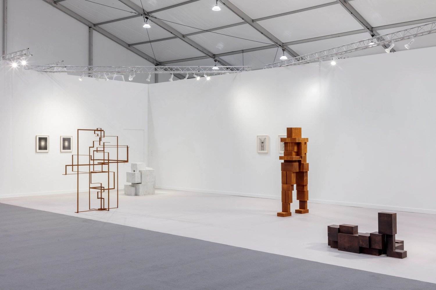The booth brings together Gormley’s sculptures and drawings, exploring the threshold between the biological body – understood as a first dwelling – and the built environment – a second body on which contemporary life increasingly depends.