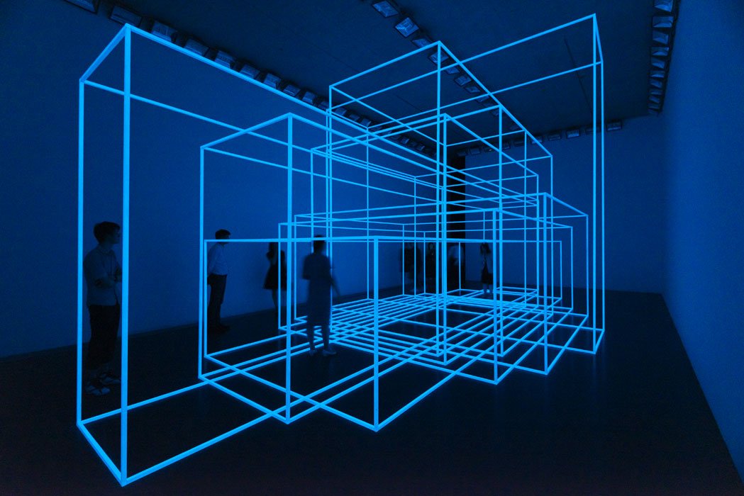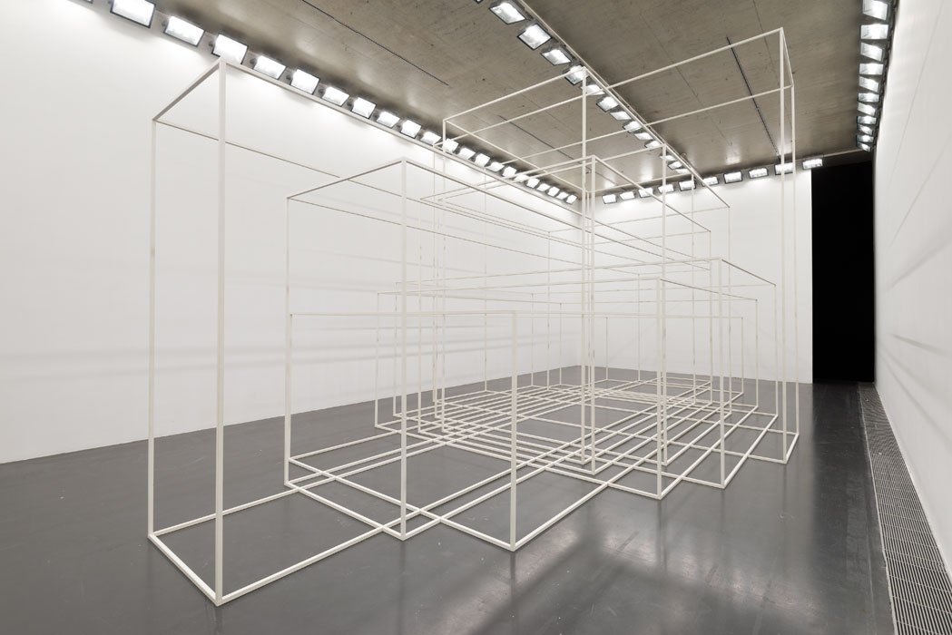 The exhibition also includes spatial works that attempt to create instruments of proprioception. Breathing Room IV [Rio] (2012) is an environment made of nesting photo-luminescent space frames all containing the same volume, but stretched in different directions. Ten minutes of darkness are interrupted by 40 seconds of blinding light. Its virtual, abstract architecture invites the viewer to look at it as an object and engage with it as a subject, providing both a soothing and confrontational experience.