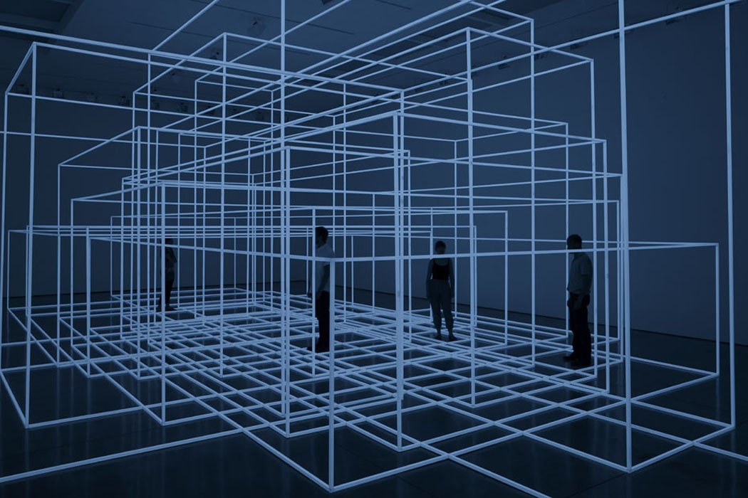 ‘Test Sites includes a major new installation of Breathing Room III, the third and largest in this series of works which contain and implicate the viewer as the figure in a shifting ground. As a physical manifestation of the gallery, Breathing Room III is made from 15 interconnecting photo-luminescent ‘space frames’, the total volume of which is equal to that of the internal gallery space. The exhibition also includes a series of new massively extended ‘blockworks’ which use an architectonic language of stacking, propping and cantilever to suggest a tension indicative of our urban-bound human condition.’