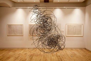 ‘I think of these drawings as being the most precise mental maps, but also body diagrams. The ‘Feeling Material’ drawings are an attempt to evoke the body as a concentration within an energy field evolved in the ‘Clearing’ drawings and it strongly relates to some sculptures where insider-like concentrations of highly wrought wire form taut cores at the centre of increasingly large orbital circuits.’