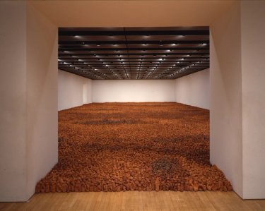 Field For The British Isles (1993) is a work comprised of approximately 40,000 small terracotta figures which were made by about one hundred community members from St Helens, Merseyside during one working week in September 1993. It was first displayed in an exhibition at Tate Liverpool in 1993. From 1994-95 the work toured to the following UK venues: Oriel Mostyn, Gwynedd, Wales (6 August - 10 September 1994); Scottish National Gallery of Modern Art, Edinburgh, Scotland (1 November 1994 - 15 January 1995); Orchard Gallery, Derry, Northern Ireland (20 March - 30 April 1995); Ikon Gallery, Birmingham, England (13 May - 24 June 1995); and the National Gallery of Wales, Cardiff, Wales (8 July - 20 August 1995).